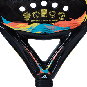 Adidas chose to use their soft energy EVA core for this racket as it helps reduce weight and increase comfort. This core provides exceptional ball output while not sacrificing on power making it a popular choice for players and is represented by a blue cap at the end of the handle. The racket frame while made of carbon boasts the Adidas Dual Exoskeleton technology which protects the frame and core of the racket. This is then further reinforced with a Power Embossed Ridge, which is an outer carbon rib in the racquet frame that provides greater rigidity to the entire structure. A system that is incorporated into the most aggressive rackets to achieve greater power when hitting the ball.