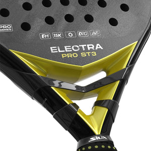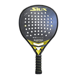 The Electra ST3 Pro is a hybrid shaped racket that has been developed by Siux in conjunction with one of the worlds most talented players, Franco Stupaczuk, to suit his game. This Padel Racket has a medium to hard feel coming from the combination of a 15K Textreme carbon fiber face and hard EVA core giving the racket ample control with loads of power when needed.