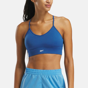 Wear this Reebok tri-back sports bra and put a little style in your training session. The soft, V-neckline creates a flattering look. The straps form a triangle pattern out back and a keyhole cutout below add breathability. Speedwick tech keeps you comfortable and dry as you lift.